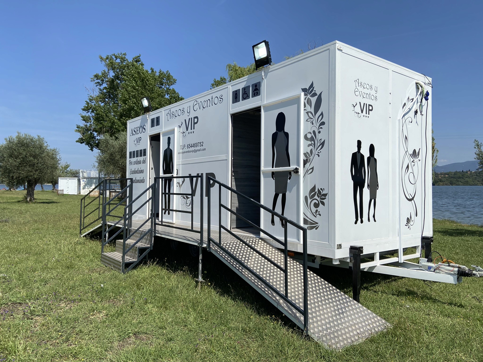 Están diseñados para ofrecer máxima comodidad y accesibilidad, con acceso tanto por rampa como por escaleras, e incorporan iluminación exterior, climatización, servicio de limpieza, control de aforo y un interior totalmente equipado con secamanos, jaboneras, espejos y todos los elementos necesarios para una experiencia cómoda y funcional.
